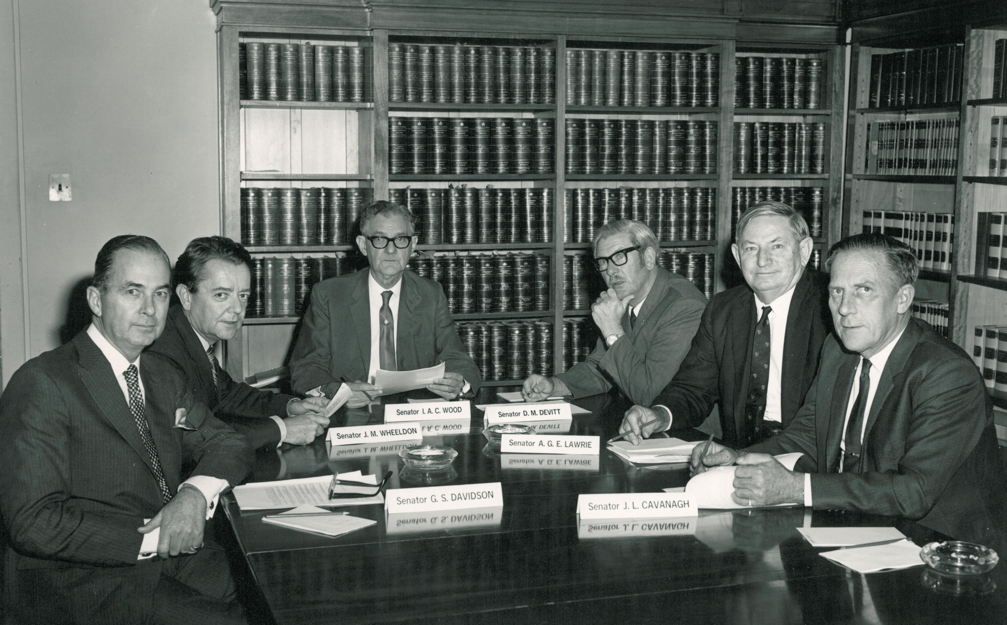Members of the Regulations and Ordinances Committee in April 1971. From left, Senators Gordon Davidson, John Wheeldon, Ian Wood, Donald Devitt, Ellis Lawrie, Jim Cavanagh.