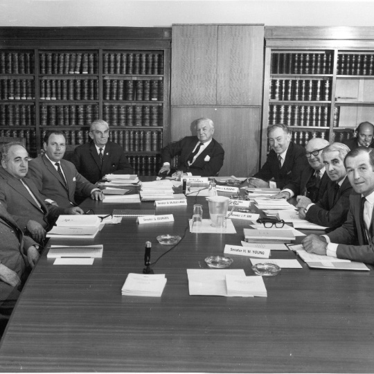 From left: Senator the Hon. Sir Alister McMullin KCMG (President of the Senate) and senators George Georges, Douglas McClelland, Kenneth Anderson, Magnus Cormack (chair), Lionel Murphy, Vincent Gair, John Sim and Harold Young