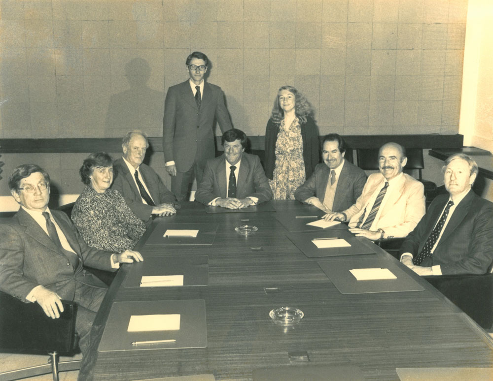 Standing Committee on Science and the Environment, 1981. Standing from left: Cleaver Elliott [Research Officer] and Sue Thomson [Research Officer]. Seated from left: Senators Colin Mason, Jean Melzer, Tony Mulvihill and Don Jessop [Chair], Peter Roberts [Secretary], Senators Michael Townley and David MacGibbon.