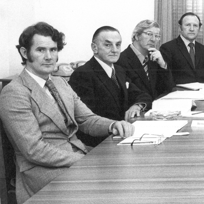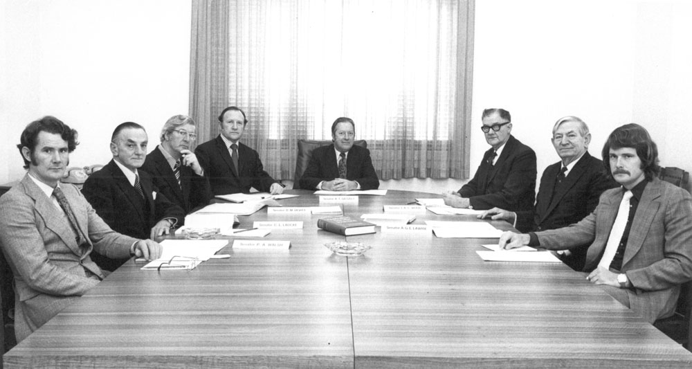 Standing Committee on Finance and Government Operations, 1975. From left Senators Peter Walsh, Condor Laucke and Don Devitt; Mr R Joske [Secretary]; Senators Arthur Gietzelt [Chair], Ian Wood and Ellis Lawrie; Mr G Watters [Research Officer]