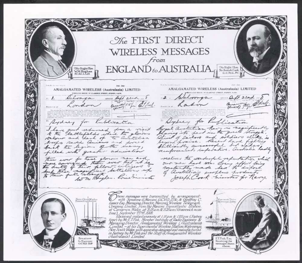The first direct wireless messages from England to Australia, Amalgamated Wireless (Australasia) (AWA)