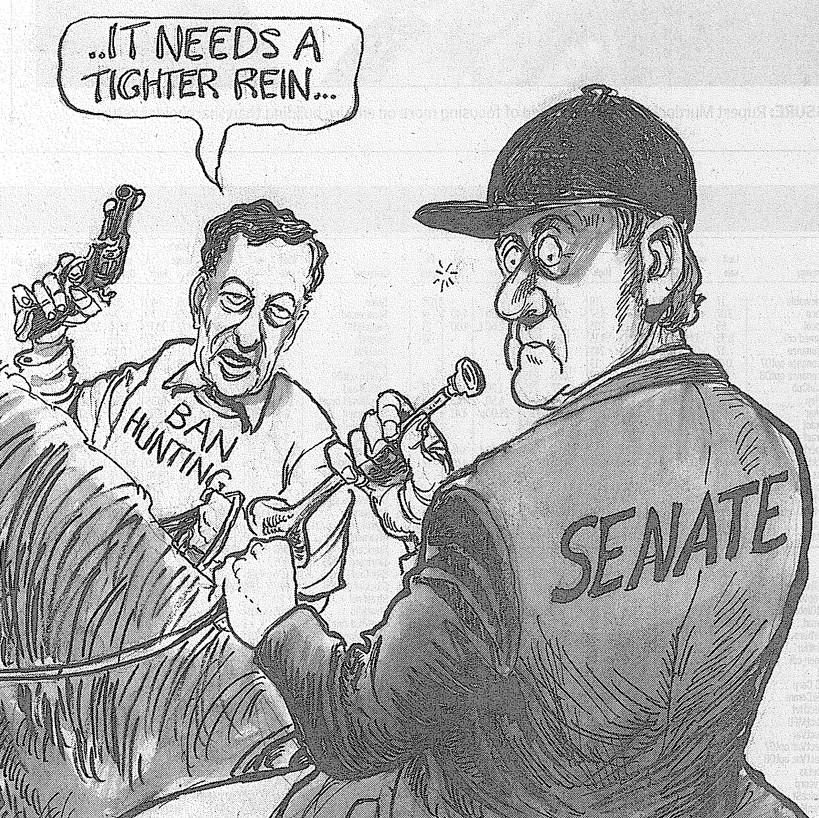 Cartoon in response to comments by Leader of the Government in the Senate, Senator Robert Hill, that the government would use its Senate majority to seek to confine the activities of the Senate estimates committees.